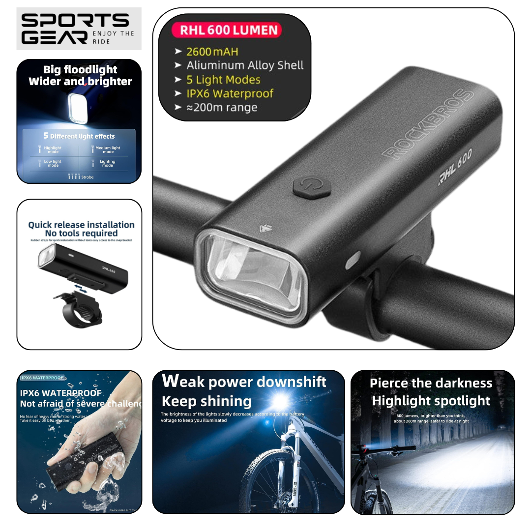 Drita e bicikletes ROCKBROS, RHL600, eshte nje zgjidhje dritash cilesore e projektuar per te permiresuar shikueshmerine dhe sigurine gjate ecjeve me biciklete.